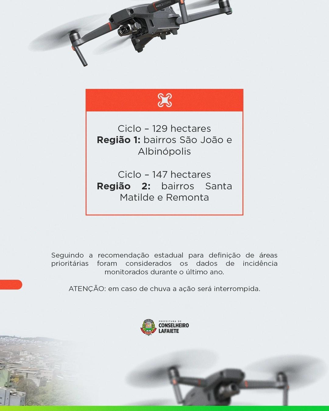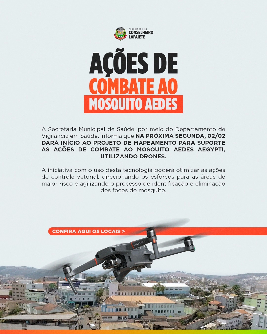 A Secretaria Municipal de Saúde de Conselheiro Lafaiete iniciou o uso de drones para mapear áreas prioritárias no combate ao mosquito Aedes aegypti, transmissor da dengue, zika e chikungunya.