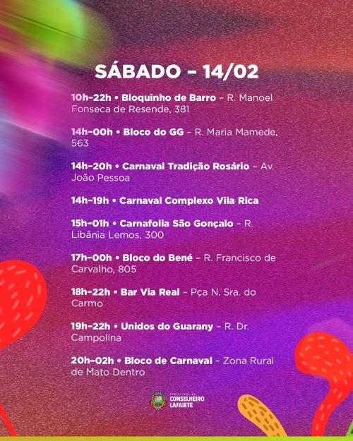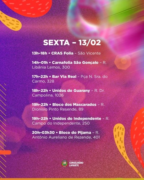 A Prefeitura de Conselheiro Lafaiete informa que haverá interdições temporárias em vias públicas a partir desta sexta-feira (13), durante as comemorações do Carnaval 2026. As medidas serão adotadas pela Secretaria Municipal de Segurança Pública e Cidadania, por meio do Departamento Municipal de Trânsito e Tráfego (DMTT).