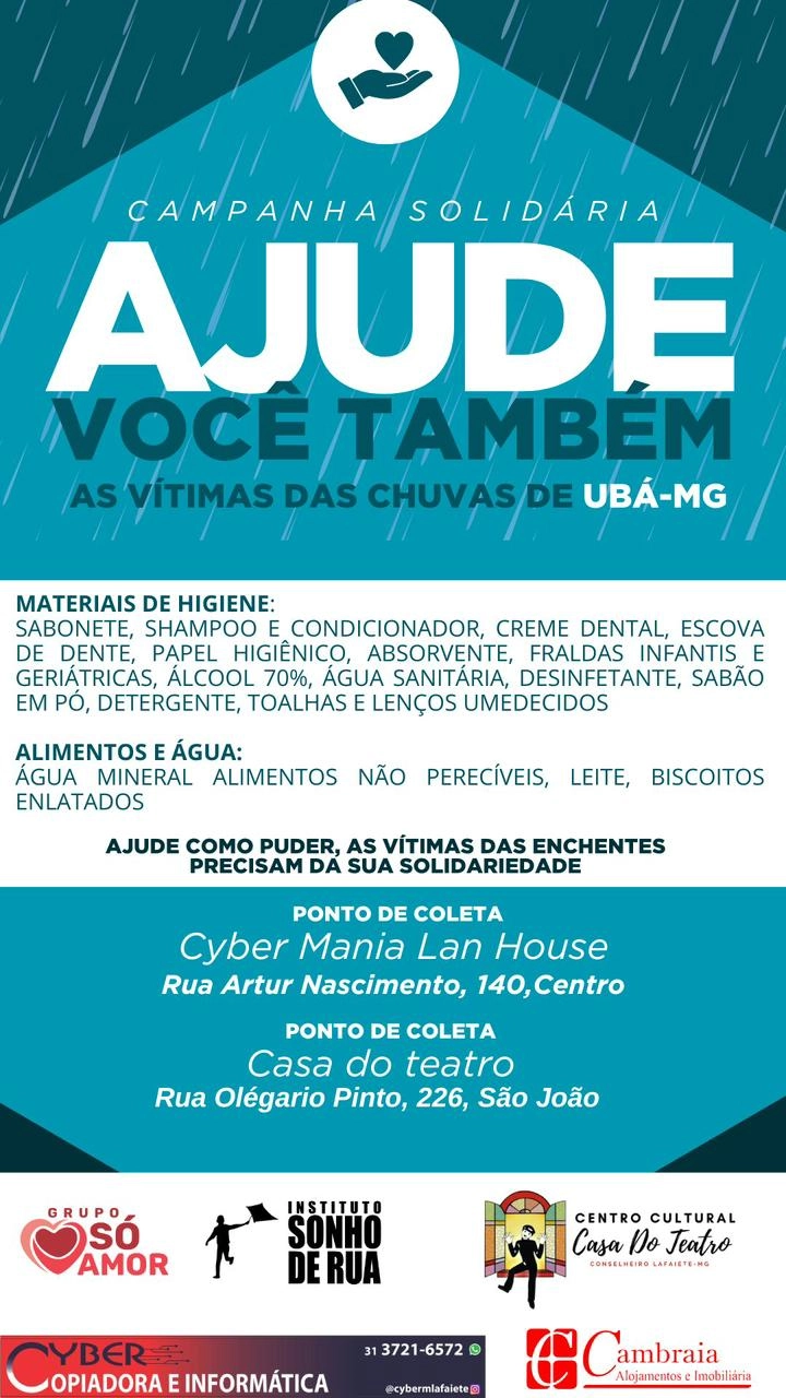 A solidariedade também mobiliza moradores de Conselheiro Lafaiete. Pontos de arrecadação de alimentos não perecíveis, água mineral, produtos de higiene e limpeza estão sendo organizados na cidade. As informações completas sobre locais e horários de entrega serão divulgadas em imagens anexadas abaixo