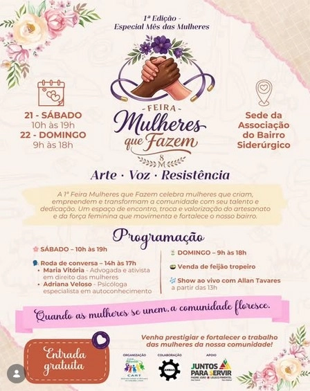 A cidade de Conselheiro Lafaiete recebe, neste fim de semana, a 1ª edição da Feira “Mulheres que Fazem”, iniciativa voltada à valorização do empreendedorismo feminino e da produção cultural local. O evento será realizado na sede da Associação do Bairro Siderúrgico, com entrada gratuita.