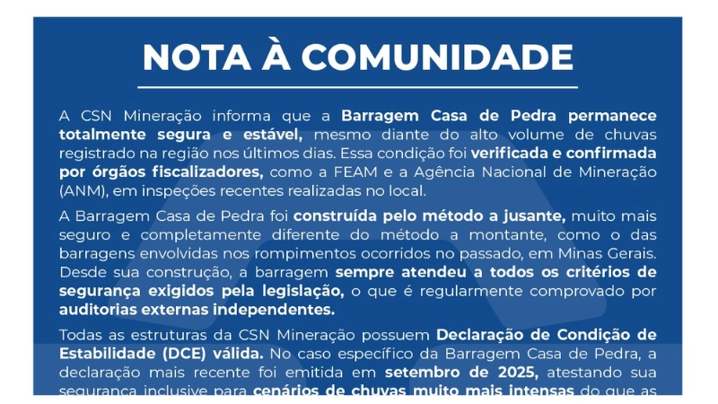 CSN afirma estabilidade da Barragem Casa de Pedra após chuvas intensas